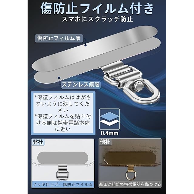 ZXZone ストラップホルダー【傷防止フィルム加工】 スマホストラップホルダー 折り曲げても浮きにくい設計・極薄0.2mmの金属製タグパッチ採用 落下防止首掛け斜めがけ肩掛け首かけ携帯ストラップ iphone android スマホアクセサリ全機種対応 (シルバー-TS)