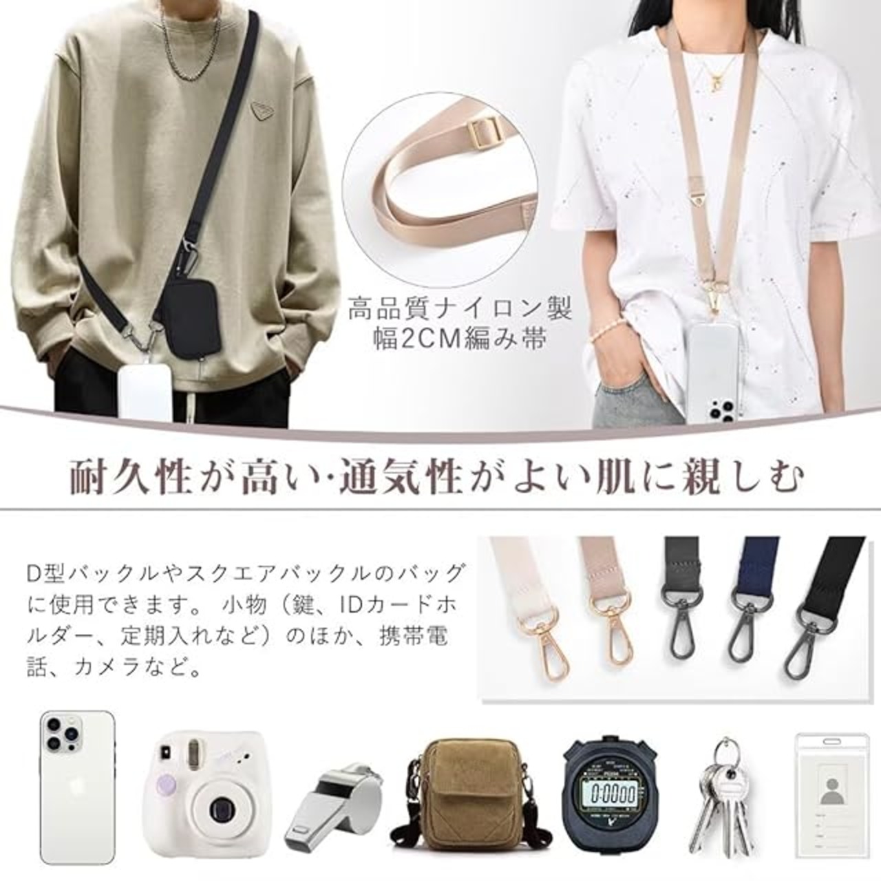 【多機能】スマホストラップとして、すべての携帯電話モデルに適用可能。バッグのショルダーベルトとしても、ほとんどのバッグやトートバッグに適しています。ボストンバッグ、カメラケース、エコバッグ、 機材ケース、保温袋、ビジネスバッグ、ショルダーバッグ 等のスペア・交換用 ショルダーです。