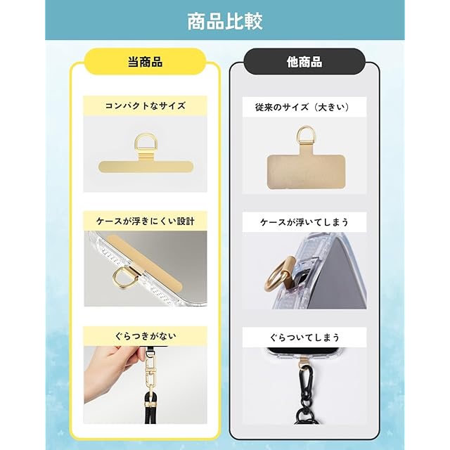 商品名:[LICOM] 【ちぎれるストレスから解放】 スマホ ストラップホルダー 極薄0.2mm 金属製 タグパッチ 落下防止 充電影響なし 首掛け 斜めがけ 全機種対応 (ゴールド)