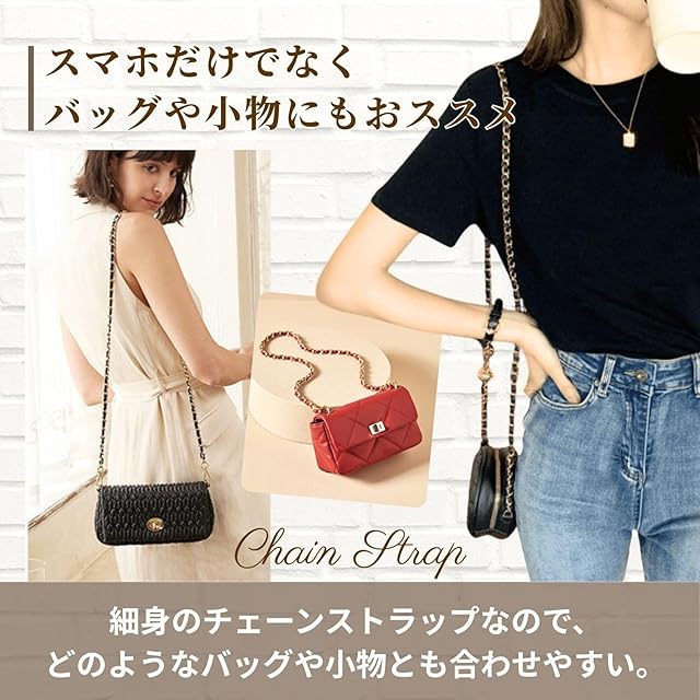 【長さ】約120cm【幅】約0.8cm【重さ】約50g【付属品】透明タグパッチ1枚 【スマホをおしゃれに持ち歩けるチェーンストラップ】斜め掛けにちょうどいい120cmサイズで、両手が自由になり外出や旅行に大活躍。幅0.8cmの細身デザインと高級感あるチェーンで、シンプルなスマホケースも一瞬で華やかなアクセサリーに変わります。付属の透明タグパッチを取り付ければ、穴のないケースでも簡単に装着可能。スマホショルダー・ネックストラップ・携帯ストラップとして多用途に使え、落下防止にも◎。カラーバリエーションは全14色、定番のブラック・ブラウンから人気のピンク・ラベンダー、アクセントになるレッド・ロイヤルブルーまで幅広く揃い、ファッションやシーンに合わせて選べます。普段使いはもちろん、通勤・お出かけ・旅行にも最適。おしゃれと実用性を兼ね備えたストラップは、ギフトにもおすすめです。 【スマホをもっと便利に、おしゃれに持ち歩くチェーンストラップ】軽量仕上げで長時間の使用でも疲れにくく、スマホやバッグ、小物にも使える万能アイテム。斜め掛けに最適な120cmサイズで両手が自由になり、通勤・通学・旅行・お出かけに大活躍。付属の透明タグパッチをケースに挟むだけで簡単に取り付け可能。iPhone12~16シリーズに幅広く対応し、フルカバーケースにも対応しています。カラーバリエーションは全14色、定番のブラックやブラウンから、華やかなレッド・ロイヤルブルー・ライトパープルまで豊富にラインナップ。ファッションに合わせて選べるのが魅力です。スマホショルダーとして落下防止にも役立ち、可愛さと実用性を兼ね備えたストラップは、プレゼントにもぴったり。毎日のコーディネートに華やかさを添える必須アクセサリーです。 【軽量設計で長時間の使用でも肩や首に負担がかかりにくい】金属チェーンにありがちな重たさを解消し、快適な着け心地を実現しました。120cmの程よい長さで斜め掛けや肩掛けに対応し、スマホを落下から守りながら両手を自由に使える便利アイテム。シンプルなケースに付けるだけで上品なアクセサリーのような印象を与え、普段使いはもちろん、通勤や旅行にも大活躍。高級感漂うデザインでファッション性と実用性を兼ね備えたスマホショルダーストラップです。 【スマホショルダーにもバッグストラップにも使える多機能チェーンストラップ】スマホストラップ 携帯ストラップ ショルダーストラップ としてはもちろん、バッグや小物にも使える万能デザイン。細身でおしゃれなチェーンは軽量設計で疲れにくく、120cmの長さで斜め掛け・首掛け・肩掛けに対応。スマホの落下防止や両手フリーでの外出に便利です。全14色展開で、ブラック・ブラウンなどの定番から、可愛いピンク・ライトパープル・鮮やかなレッドまで豊富にラインナップ。iPhoneケースに簡単取り付けできる透明タグパッチ付きで、機能性とデザイン性を兼ね備えた人気アイテム。普段使いから旅行・通勤まで幅広く活躍します。 スマホストラップ スマホショルダー ショルダーストラップ 携帯ストラップ ネックストラップ スマホチェーン スマホショルダーストラップ スマホストラップホルダー iphoneストラップ iphoneショルダーストラップ iphoneネックストラップ スマホケースストラップ スマホストラップ肩掛け スマホショルダー斜め掛け 携帯ストラップ首掛け 携帯ショルダーストラップ 首掛けストラップ スマホ斜め掛け人気 スマホ落下防止ストラップ スマホ紐ストラップ 携帯ショルダー バッグストラップチェーン スマホストラップレディース スマホショルダーストラップ可愛い スマホショルダー可愛い スマホストラップかわいい 携帯ストラップおしゃれ ショルダーストラップスマホ スマホアクセサリー人気 スマホストラップ可愛い人気