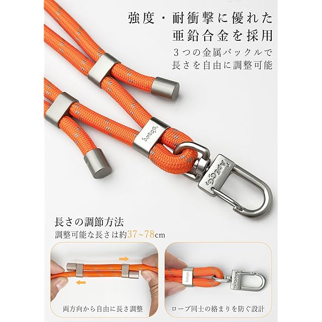 【長さ調節可能・多彩な着用スタイル】両方向スライド式の調節バックルで、ストラップの長さを自由に調整可能。絡まり防止設計により、日常使用でもスッキリとした状態をキープ。調節範囲は37cm〜78cmで、身長や体型に合わせた調整が可能。首掛け、肩掛け、斜め掛けなど、シーンに応じて柔軟に切り替えられます。