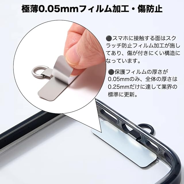 【傷防止フィルム加工、0.25mm極薄設計】:金属製でスマホを傷付けないように、スマホに接触する面はスクラッチ防止フィルム加工が施してあり、傷が付きにくい構造になっています(本社の専門技術)。他の製品は自分で傷防止フィルムを貼り付けて、非常に手間を取り、本製品はこの手間なし、直接的に使用できます。更にホルダーの厚さが0.2mm, 保護フィルムの厚さが0.05mmのみ、全体の厚さは0.25mmだけに達して業界の標準に更新されて、市場の他のフィルム付けホルダーが一般的に0.4mmの厚さです。本社の0.25mm製品を装着すると、スマホが浮き上がる問題点をご心配しないでください。