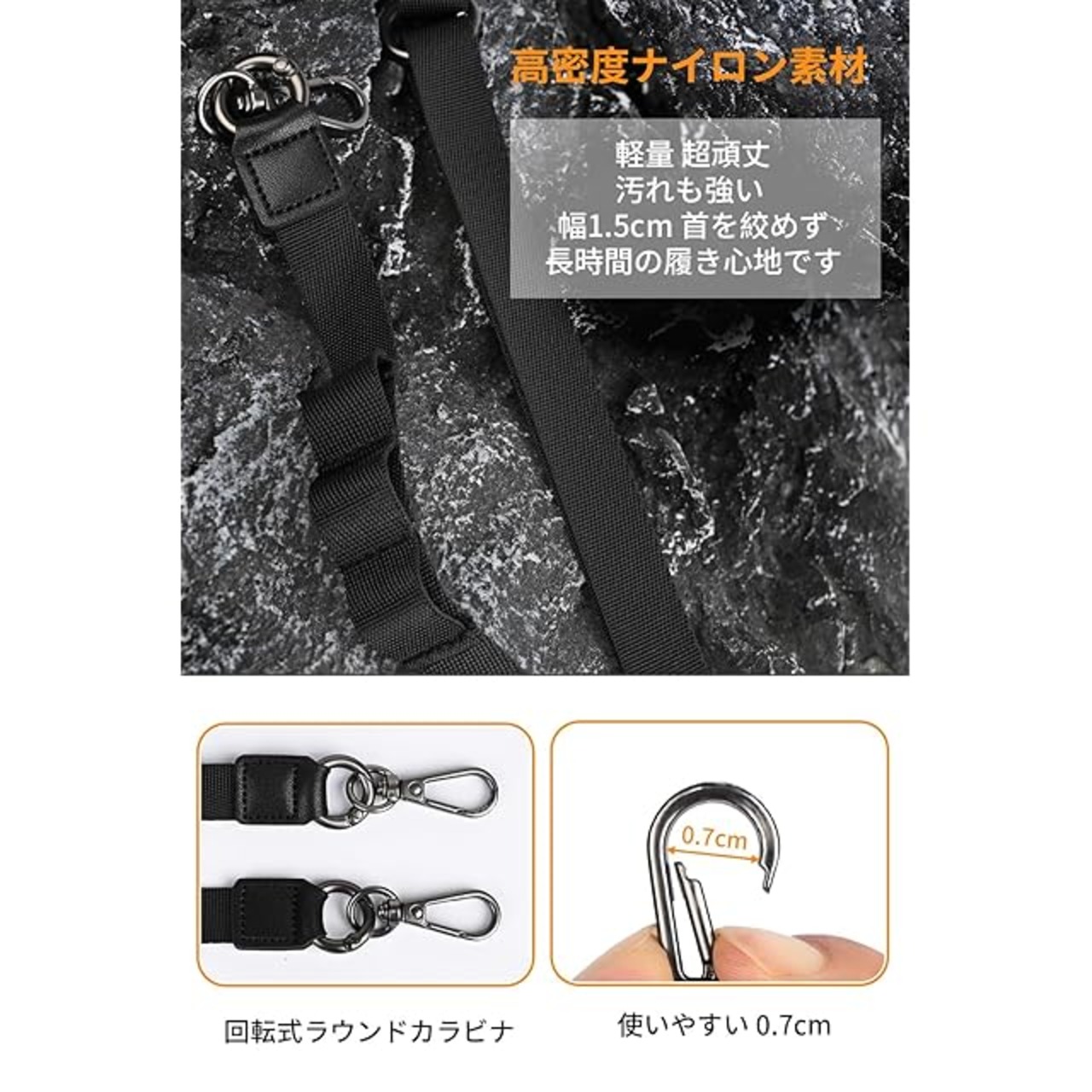 ✅【✨サイズ✨】:幅1.5cm 着用長さ45cm~75cm (金具含む)【✨内容物✨】: ストラップ 1本 、ストラップカードカード2枚、カラビナ 1枚、ストラップひも4枚(根付が付いているのでスマホやカメラの本体などのナスカンで付けられない部分にも付けられます)。