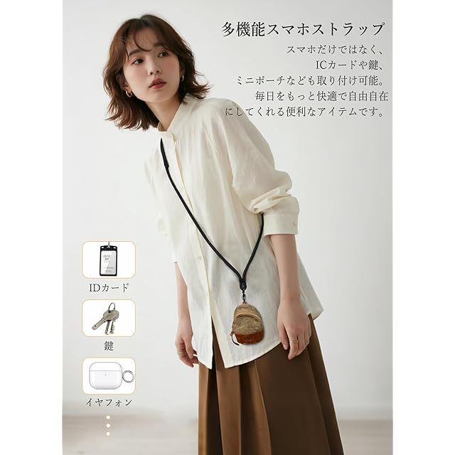 本製品は直径6.5mm、全長さ約160cmの高品質ポリエステル素材を使用しており、柔らかく耐久性に優れ、長時間の使用でも快適で首や肩に負担をかけません。接続部分には耐衝撃性のある亜鉛合金バックルを採用し、スマホをしっかり保護します。ストラップの長さは37cm〜78cmで自由に調節可能で、絡まりにくい設計。首掛け、肩掛け、斜め掛けなどさまざまなスタイルに対応します。通勤・買い物・旅行・アウトドアなど、さまざまなシーンでスマホの落下や紛失を防止でき、小物入れやコインケースと合わせて使うことも可能です。付属品:クリップ×1、360°回転金属パーツ×1、保護フィルム×2。多機種・ケース対応で、購入後は30日間のアフターサービス付き、安心してご使用いただけます。