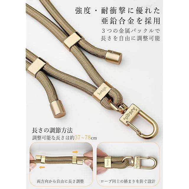 【長さ調節可能・多彩な着用スタイル】両方向スライド式の調節バックルで、ストラップの長さを自由に調整可能。絡まり防止設計により、日常使用でもスッキリとした状態をキープ。調節範囲は37cm〜78cmで、身長や体型に合わせた調整が可能。首掛け、肩掛け、斜め掛けなど、シーンに応じて柔軟に切り替えられます。
