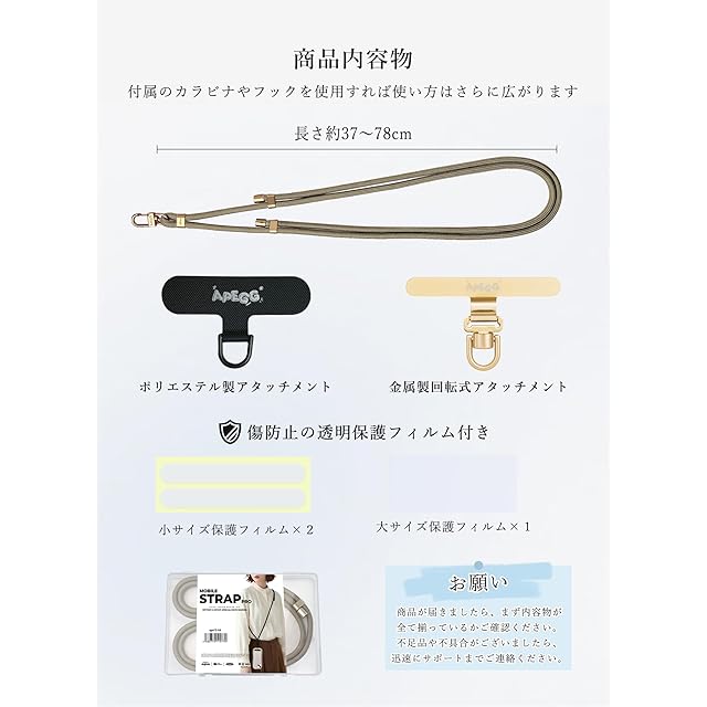 商品名:[APEGG] スマホストラップ 携帯ストラップ 肩掛け 斜め掛け 首掛け 丸紐6.5mm 長さ調節可能 スマホショルダー ストラップホルダー2枚付き 全機種対応 紛失・落下防止 軽量 Khaki