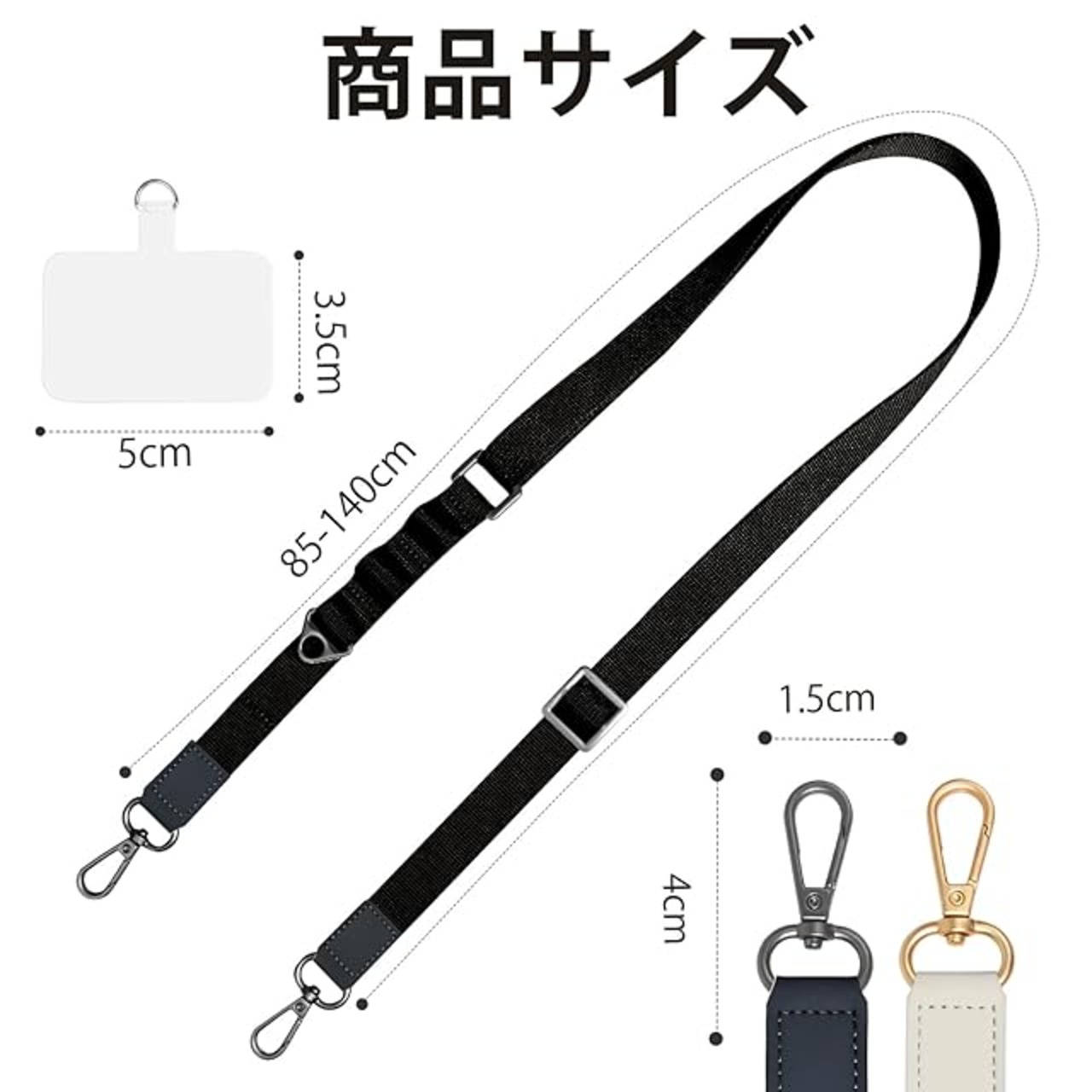 <p>シンプルなデザインで合わせやすいストラップ。</p> <p>ナスカンやキーホルダーなどを取り付けられる物掛けは3つがあります。 ストラップホルダーが付属しているため、ストラップホールのないスマホケースの場合、ストラップホルダーをスマートフォンとケースの間に挟むだけで使用することができます。</p> <p>充電ホール付きのケースに装着可能。 底が覆わないケースには装着できません。 底の形状はお使いのケースによって異なりますので、ご注文の際はお使いのケースをご確認ください。</p> <p>スマートフォンだけでなく、斜め掛けや肩掛け、ネックストラップなどの小物入れにも使えます。 ハンズフリーになれますので、通勤やお買い物など日常生活にも最適です。 ストラップホルダーを挟んだまま充電も可能。</p> <p>ショルダーストラップの幅は2cmで、長時間の装着でも肩に負担がかからない。</p> <p>ショルダーストラップ1+ストラップホルダー1</p> <p>デザイン性と機能性に優れ、プレゼントにも最適。 また、値段も手頃なので、気軽にプレゼントすることができます。</p> <p>【品質、安心のアフターサービス】</p> <p>商品の使用中に品質問題が発生した場合は、直ちにご連絡ください、100%満足するまで、商品交換などを提供致します√。</p>