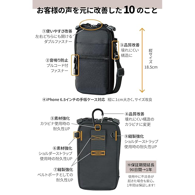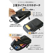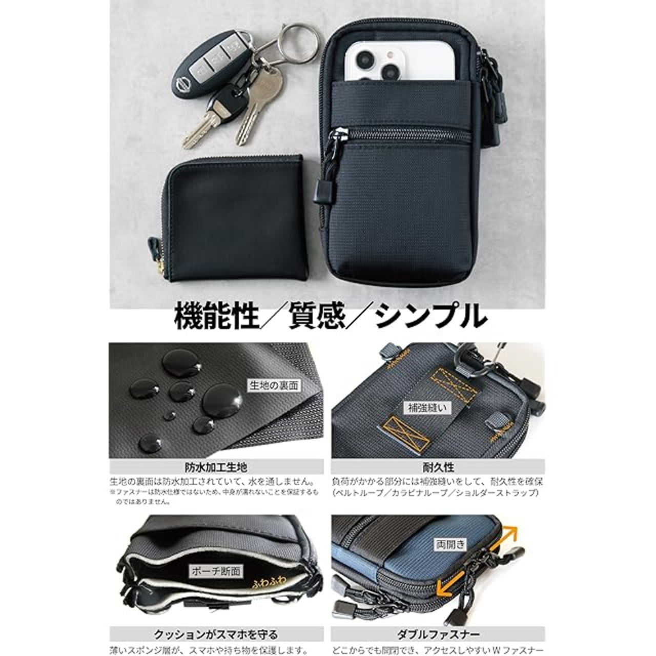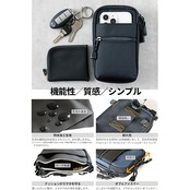 <b>◆ちょうど良いサイズ感</b><br><br> ● スマホや、モバイルバッテリー、小銭入れ、デジカメなどを収納するのにちょうどいいサイズ感のポーチ。<br> ● スマホ2台を別々に収納することも可能です。<br> ● 2箇所の大きなジッパーポケットとと、フロントのジッパーポケットに小物をわけて収納することができます。<br><br> <b>◆使い方いろいろ 4WAYタイプ</b><br> ・ショルダーバッグとして<br> ・カラビナでズボンのベルトループにひっかけて<br> ・ポーチのベルトループにベルトを通してベルトに取り着けて<br> ・そのままポーチとして<br><br> <b>いろいろな使い方のできる、4WAYタイプのガジェットケースです。</b><br><br> ・ポーチ寸法: 約18.5cm(縦) x 11.0cm(横) x 4.0cm(厚み)
