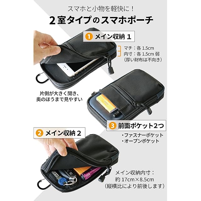✅【 最低限の持ち物をコンパクトに 】 スマートフォン、鍵、小銭入れなど、最低限の持ち物を携帯するのに適した薄型のポーチ。メイン収納が2室あり、スマホや携帯電話と小物を分けて収納できます。スマホ2台を別々に収納可能。収納できるスマホは、手帳ケースに入っていない6.5インチ前後まで(サイズ目安:縦17cm✕横8.5cm)。※手帳型ケースは厚みが増すため、縦16.3cmまでが推奨サイズです ✅※注意※薄マチのため、厚みのある二つ折財布は収納できません。長財布は縦の寸法が足りないため収納できません。
