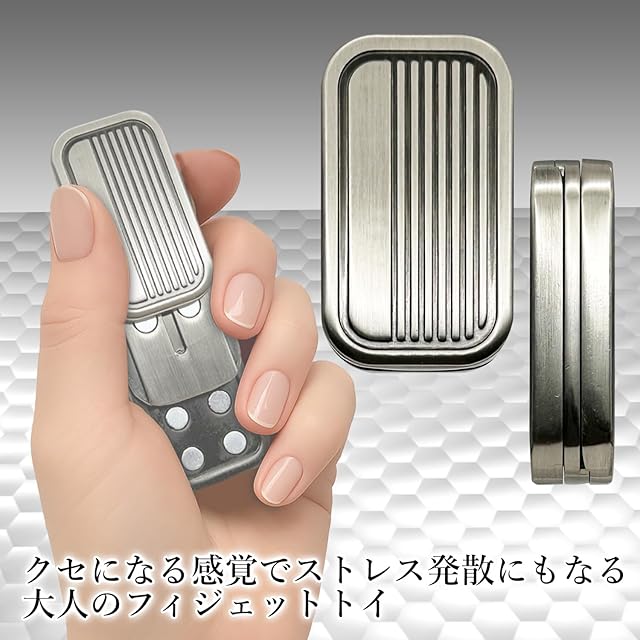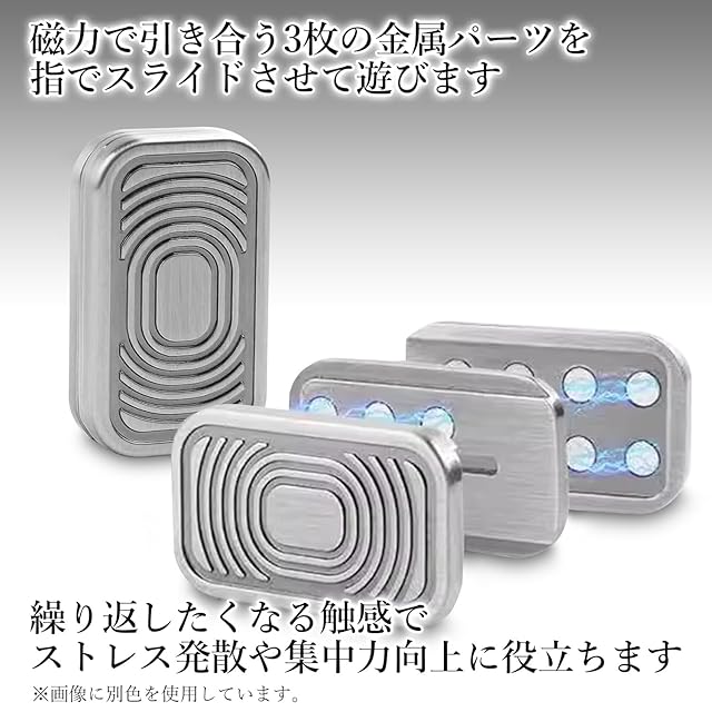 磁石の力でスライドして遊ぶ小型のハンドトイです。3枚の金属パーツが磁力で引き合いながらスライドする感触を楽しむもので、ストレス解消や集中力向上、手持ち無沙汰の解消に適しています。