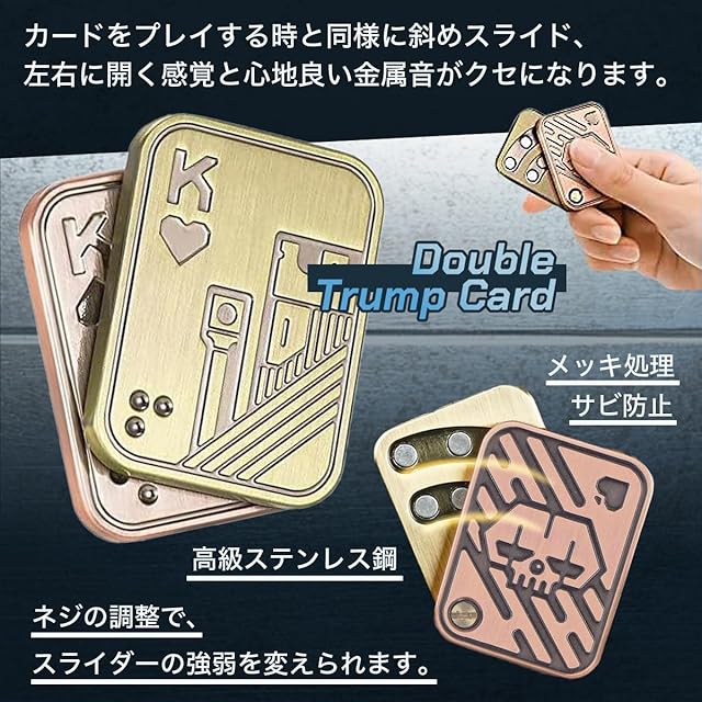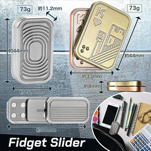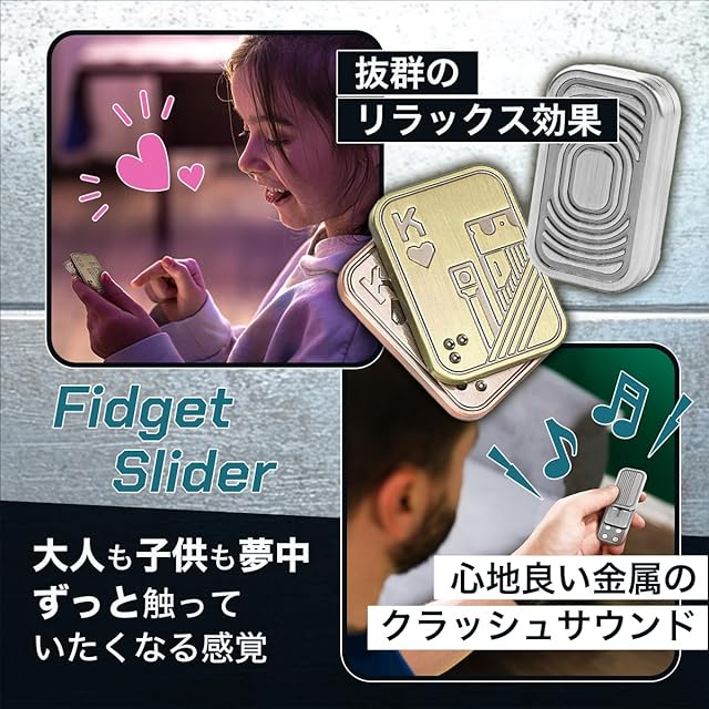 <br><br>高品質なメタルフィジェットスライダーでストレス解消 このメタルフィジェットスライダーは、精密に機械加工された高品質なステンレス素材で作られており、耐久性に優れています。指先で簡単に操作でき、鮮明な金属音と磁力によるフィードバックで、ストレス解消や集中力の向上に最適です。片手で簡単にプレイできるので大人向けのフィジェットトイとして、仕事や学業でのリラックスアイテムに最適な選択です。<br><br>悪い習慣をやめるサポートアイテムとしても効果的 爪噛みや喫煙など、悪い習慣を断ち切る手助けをしてくれるフィジェットスライダーです。手持ち無沙汰な時にこのスライダーを使うことで、無意識の習慣を置き換えることができるので、集中力UPや思考の刺激になります。心地良い金属のクラッシュ音と触覚フィードバックが楽しめ、集中力を高めるだけでなく、リラックス効果も期待できます。<br><br>精巧でユニークな磁気デザインと心地よい操作感を実現 トリプルプッシュカードは、3層の金属シートと潤滑パッド、内部に搭載された強力な磁気により、上下のスムーズな操作感と心地よい金属音を生み出します。また、ダブルトランプカードはカードをプレイする様に斜めスライドすることで、左右に開く感覚と心地良い金属音がクセになります。ネジの調整によりスライダーの強弱を変えることも可能です。<br><br>多用途で贈り物にも最適なフィジェットおもちゃ デザイン性と実用性を兼ね備えたフィジェットトイは、ギフトとしても大変喜ばれるアイテムです。お子様の手遊びアイテムとしてだけでなく、父親、友人、兄弟、パートナーへの誕生日やクリスマス、新年の贈り物に最適です。ストレス解消アイテムとして、年齢や性別を問わず、誰にでも喜ばれるプレゼントです。<br><br>ポータブルデザインでどこでも気軽に使用可能 コンパクトで73gと軽量なデザインにより、フィジェットスライダーは持ち運びが簡単です。ポケットにすっぽり入るサイズで、ハンドバッグやバッグパックに入れておけば、オフィス、学校、旅行先、公共の場所など、いつでもどこでも気軽に楽しめます。 【セット内容】フィジェットスライダー2種セット【サイズ】約44㎜x33㎜x8㎜、約44㎜x25.8㎜x11.2㎜※対象年齢6歳以上<br><br>