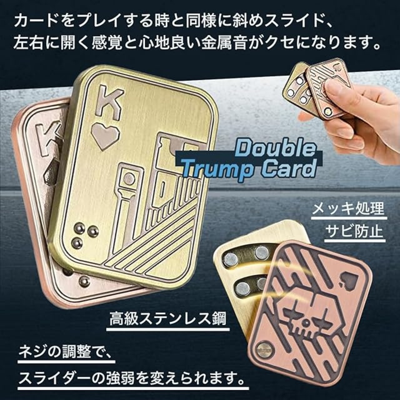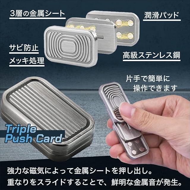 精巧でユニークな磁気デザインと心地よい操作感を実現 トリプルプッシュカードは、3層の金属シートと潤滑パッド、内部に搭載された強力な磁気により、上下のスムーズな操作感と心地よい金属音を生み出します。また、ダブルトランプカードはカードをプレイする様に斜めスライドすることで、左右に開く感覚と心地良い金属音がクセになります。ネジの調整によりスライダーの強弱を変えることも可能です。