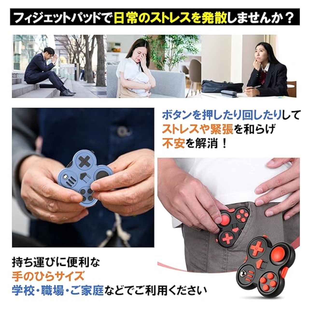 ストレス解消グッズのご紹介です!このフィジェットパッドで、日常のストレスを発散しませんか?ボタンを押したりねじったりして、ストレスや緊張を和らげ、不安を解消できます。手のひらサイズで持ち運び便利。職場や学校など、いつでもどこでもご利用可能です。見た目もスタイリッシュなデザインです!