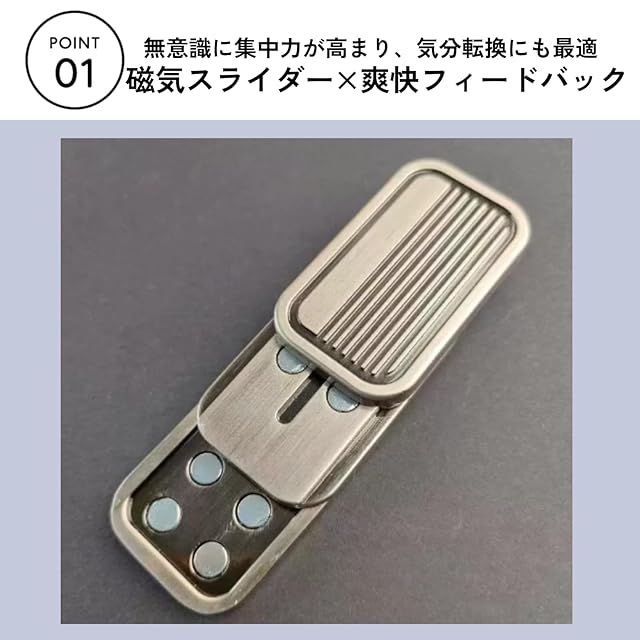 【磁気スライダー×爽快フィードバック】スライダーを動かすたびに、内部の磁石が噛み合い、「カチッ」という金属音と共に心地よい磁気フィードバックが手に伝わります。まるでトランプをシャッフルするような感覚がクセになる。遊びながら無意識に集中力が高まり、気分転換にも最適です。