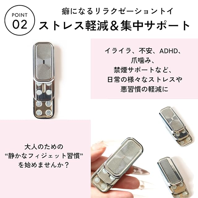 【ストレス軽減&集中サポート】イライラ、不安、ADHD、爪噛み、禁煙サポートなど、日常の様々なストレスや悪習慣の軽減に。手軽に遊べて心が落ち着く、癖になるリラクゼーショントイ。大人のための“静かなフィジェット習慣”を始めませんか?