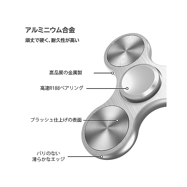 商品詳細<br> 2 つのプレー方法<br> 片手にハンドスピナーを持ち、もう一方の手は速く回転し、連続的に小幅に叩くことで、無期限に回転することができます。テーブルの上で回転させたい場合は、片手で中心を押さえ、もう一方の手で力を加えると、手を放してもスムーズに回転する。<br> 少し練習すれば、この金属製のおもちゃは指一本で操作することができます。<br><br> 高速回転 静音<br> ハンドスピナーは耐久性、耐摩耗性、潤滑性に優れたR 188ステンレス軸受、SLA技術とレーザー工業成形技術を採用している。高速で長時間回転でき、騒音もありません。<br><br> 高品質素材 耐久性<br> 本体は、高品質のアルミニウム合金製で、優れた職人技が施され、コーティングは色あせしにくい。耐久性、耐摩耗性、抗酸化性、無毒、耐腐食性、品質が高く、使用寿命が長く、手触りが非常に良い。<br><br> 携帯用スピナー ストレス解消 暇つぶし<br> これは小型の回転器で、ストレスを緩和したり、集中したり、時間をつぶすのに役立ちます。<br> 集中力が集中していない、多動、不安、強迫のに適です。<br> 音はほとんどなく、どこでもいつでも使用でき、誰にも邪魔にならない。<br> ポケットに入る小型・軽量のミニサイズは、片手で簡単に演奏でき、感触も申し分ありません。<br> 退屈したり、緊張したり、考えたりしている間に楽しんだり、友達と試合をしたりして、誰がもっと長く回っているかを見ることができます。<br> 友達、子供、同僚、家族への素敵なプレゼントです。(8歳以上の子供や大人向けのおもちゃ。)<br> 製品仕様<br> 本体:長さ69mm、高さ60mm、厚さ7.6mm<br> 重さ:85g<br> 素材:アルミニウム合金<br>