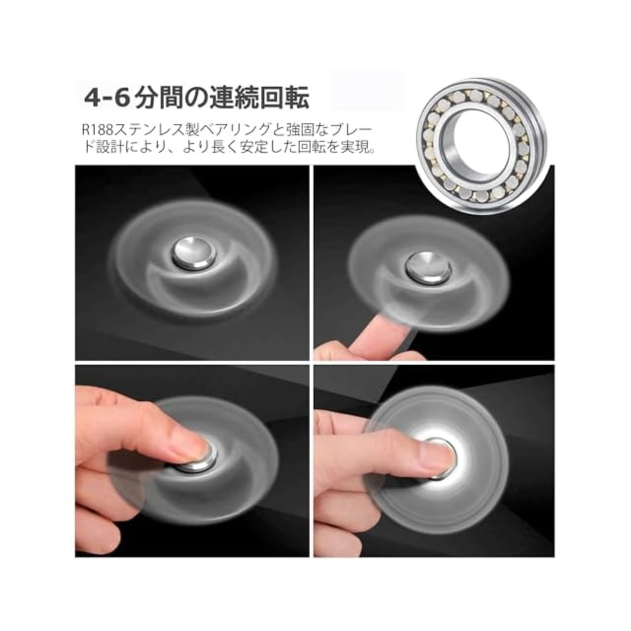 【優れたベアリング】内部軸受は、耐久性、耐摩耗性、潤滑性に優れたR188ステンレス製静音ボールベアリングで、長時間回転可能で、通常4~6分回転させることができる。スムーズな回転と低摩擦には驚かされることだろう。