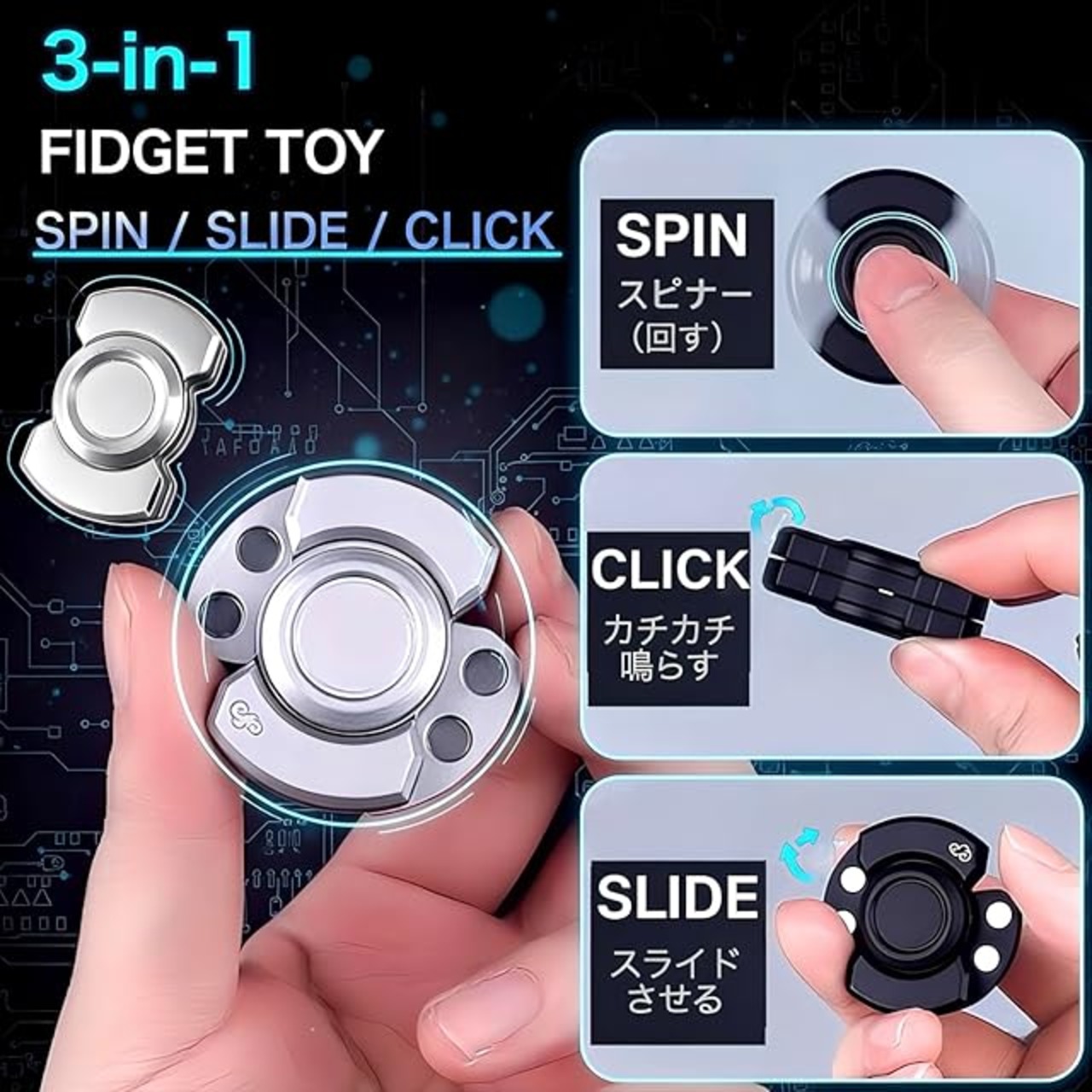 商品名:フィジェットトイ 3in1【スライド・スピン・クリック全て】 よく回る 金属 手遊び 大人 ADHD おもちゃ 落ち着く EDC グッズ ストレス発散 fidget toys スライド (シルバー)