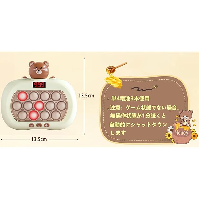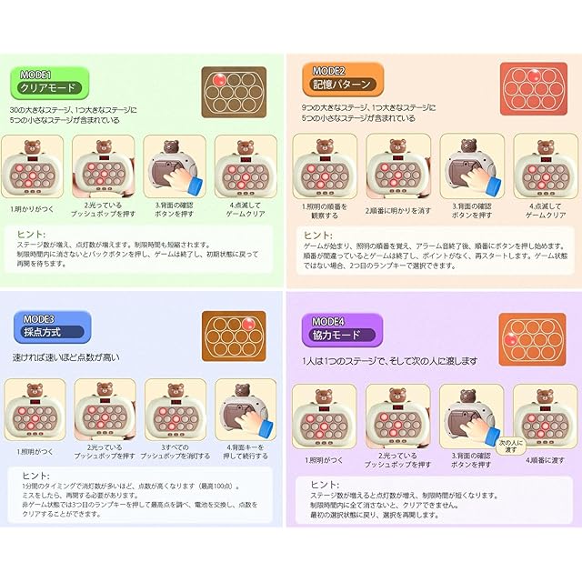 【最新版4つの楽しいゲームモード】999+レベル、スクリーン付きます。4つのモデル「ブレイクアウトモード」、「スコアモード」、「メモリーモード」、「マルチプレイヤーモード」。ランダムに点灯するバブルを覚えて、正確に素早く押して各レベルをクリアし、間違えた場合はゲームオーバーになります。13 個のマウス キー、オン キー、ボリューム キー、選択キー、戻る確認/開始キーが含まれています。各モードには異なる難易度レベルがあり、子供たちの反応速度、記憶力、協調能力を鍛えるのに役立ちます。親子の交流に最適です。
