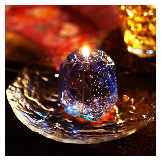 火を灯すと氷が溶ける様な透明感の中で幻想的な温かい光を放ちます。