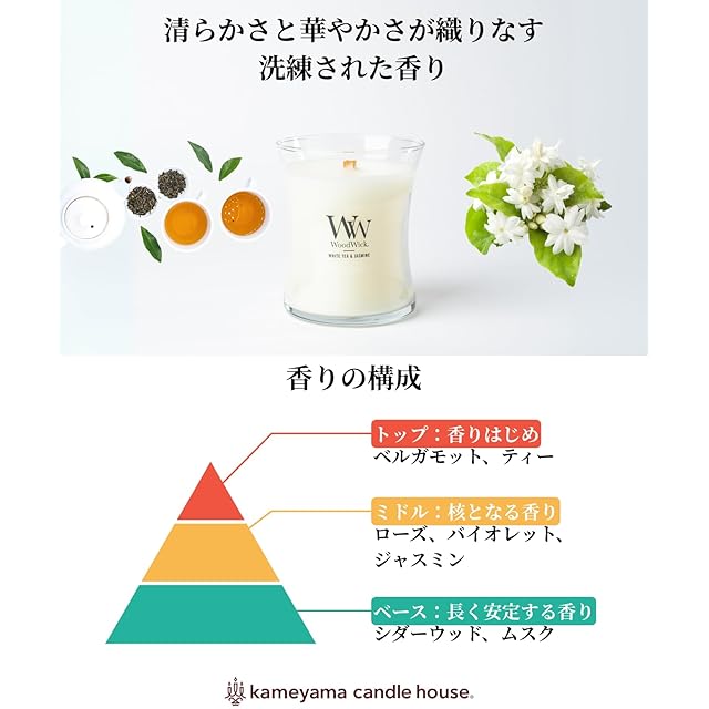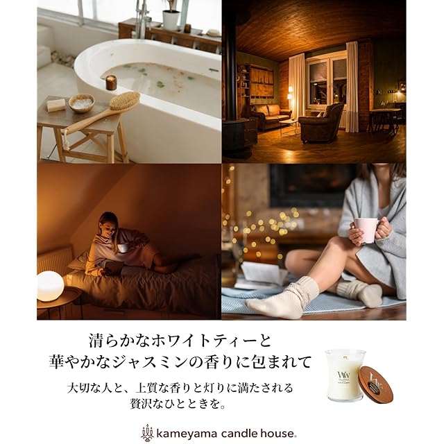 商品名:カメヤマキャンドルハウス WoodWick ジャーM ホワイトティー&ジャスミン 木製芯 パチパチ音 アロマ woodwick アロマキャンドル 焚き火の音がするキャンドル ギフト
