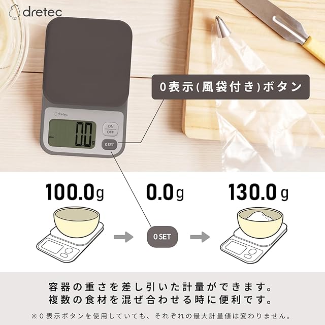 押しやすい大きなボタンなどシンプル設計で使いやすい!ボタン周りに隙間がないので、粉が入り込まない仕様となっています。 ボタンひとつで容器の重さを引いて計れる風袋引き機能付き。「0表示」ボタンを押すだけなので調理中も手を止めることなく測定できます。