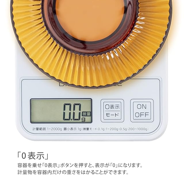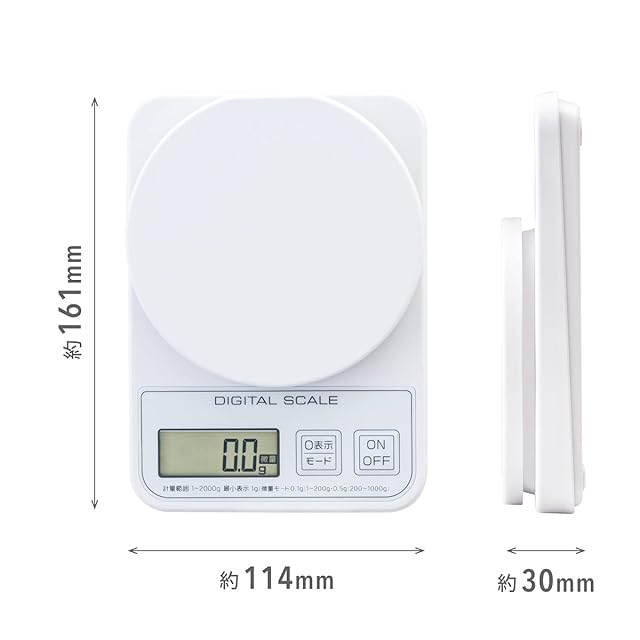サイズ:114×161×高さ30㎜ 最大計量:2000g 最小表示:1~200gまで0.1g/200~1000gまで0.5g/1000~2000gまで1g 電源:単4電池2本 オートオフ機能付き 材質:ABS樹脂