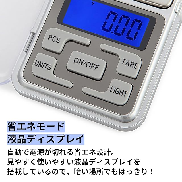 【正確な計量】 0.01g~500gまで精密計量可能です。 風袋機能が付いているので、容器や皿の重さを取り除くことができ、 計数機能でアイテムの数量を電子スケールに表示できま 0.01gからはかれるので、平らなところに水平に置き、はかりを拭きとってからはかってください。