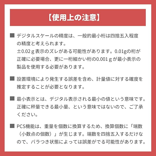 省エネ設計のポケットデジタルスケール 【使用上の注意】 ●デジタルスケールの精度は、一般的最小桁は四捨五入程度の精度と考えられます。 ±0.02g表示のズレがある可能性があります。0.01gの桁が正確に必要場合、更に一桁細かい桁の0.001gが最小表示の製品を使用する必要があります。 ●設置環境により発生する誤差を含め、計量値に対する確度を推定することが必要となります。 ●最小表示とは、デジタル表示される最小の値という意味です。 正確に秤量できる最小量、という意味ではないので、ご了承ください。 ●PCS機能は、重量を個数に換算するため、換算個数に「端数(小数点の個数)」が生じます。端数を四捨五入するだけなので、バラつき状態によっては誤差がでる可能性があります。