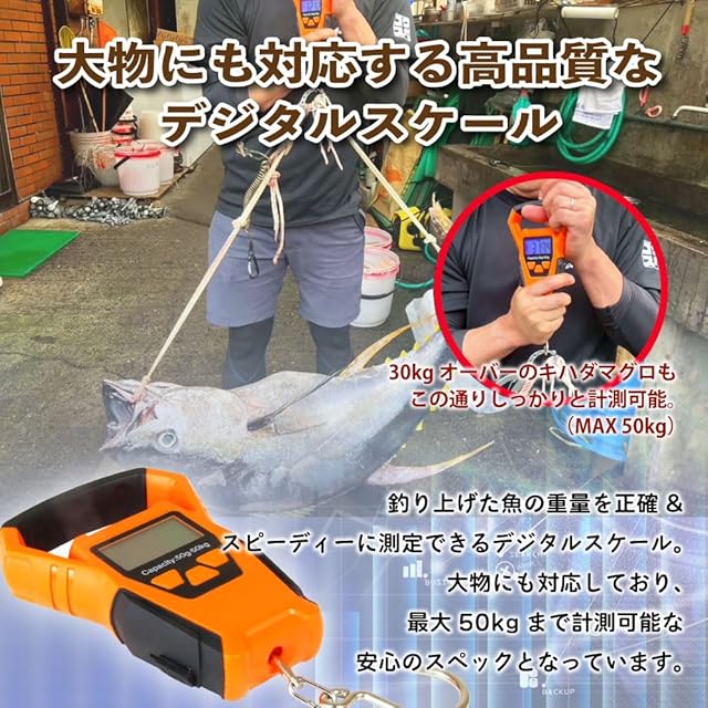 大物にも対応しており、最大50kgまで計測可能な安心のスペックとなっています 濡れた手でも気にせず使える防水ボディーを採用、船上や雨天時の使用も安心です