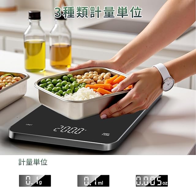 【多機能、使いやすい】風袋引機能付き。gモード、ozモード、mlモード:液体の体積を測量可能、計量カップは必要ありません、キッチンスケールには必要な機能だろう。オートオフ: 60秒で無操作オートオフ。重量超過提示、低電量提示など機能。