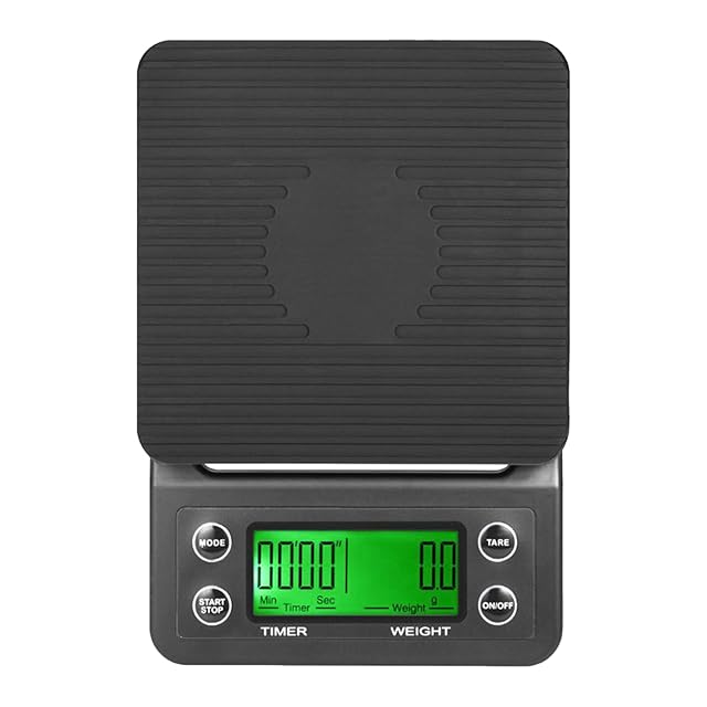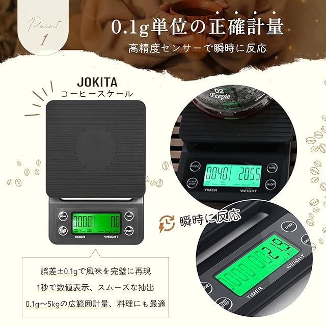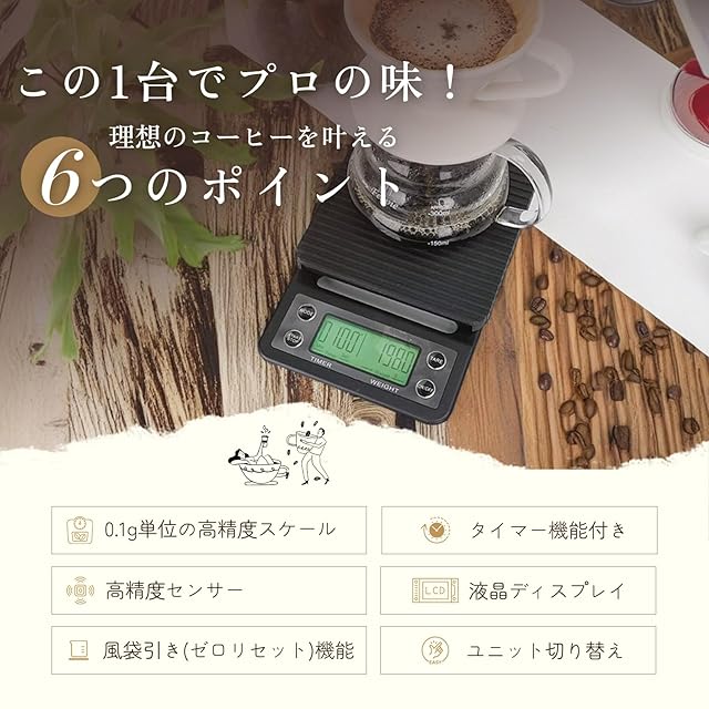 【滑り止め*軽量設計】コーヒースケール本体の重量は約309gです。コンパクトで軽量なため、持ち運びに便利です。さらに、滑りにくいシリコンパッドを装備しているため、デリケートなガラスアイテムを安全に保護することができます。 【高精度スケール】大型液晶画面と見やすいバックライトを搭載し、どの角度からでも文字がしっかりと見えるようにしまして、暗い場所でも簡単に測定できます。また、高精度のセンサーを搭載しており、計量精度は0.1gで、計量範囲は1gから5kgまでです。 【風袋引き*リセット機能】最長99分59秒まで表示されるタイマー機能があります。美味しいコーヒーを淹れるためには、抽出量と抽出時間を正確に測定することが重要です。風袋引き機能、自動校正、オートパワーオフなどの便利な機能を備えたデジタルスケールです。 【幅広い用途&省エネ】このデジタルスケールは、コーヒーだけでなく、調理用の粉末調味料や液体調味料、お茶、料理など、さまざまな用途に利用することができます。また、省エネ設計として、60秒後に自動的に電源が切れるオートパワーオフ機能を搭載しており、電池の消耗を抑えることができます。 【包装内容と期間】パッケージ内容:コーヒースケール、2本の単4形電池、日本語のユーザーマニュアル。初期不良に対しては、購入後30日以内に返金または交換を提供します。製品に問題がある場合や、製品自体に問題がある場合(初期不良など)、すぐにお問い合わせください。連絡先の取り方については、以下の手順に従ってください:「アカウントサービス」→「注文履歴」→「販売者に連絡する」