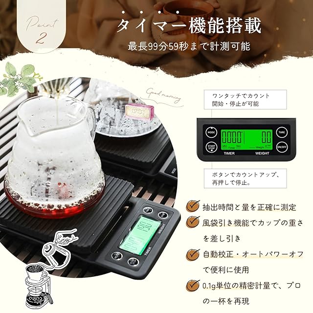 【風袋引き*リセット機能】最長99分59秒まで表示されるタイマー機能があります。美味しいコーヒーを淹れるためには、抽出量と抽出時間を正確に測定することが重要です。風袋引き機能、自動校正、オートパワーオフなどの便利な機能を備えたデジタルスケールです。
