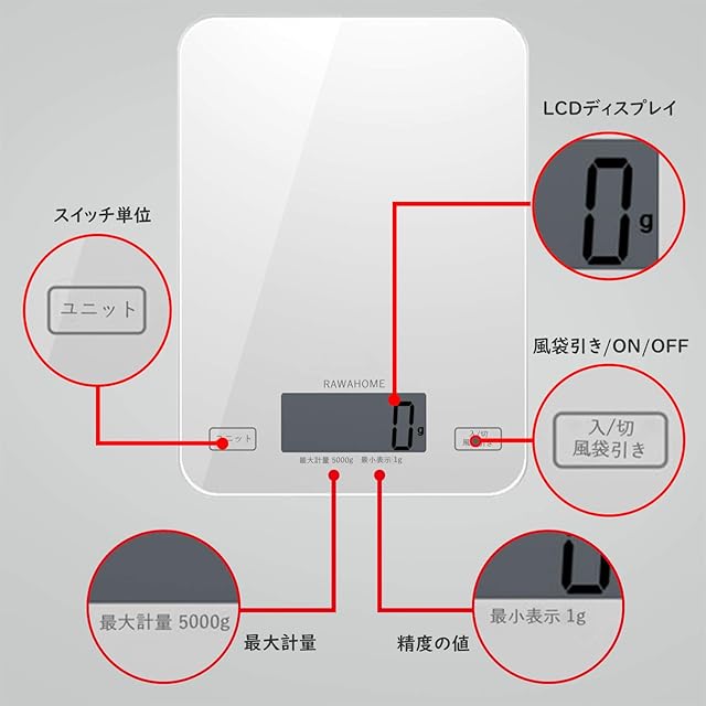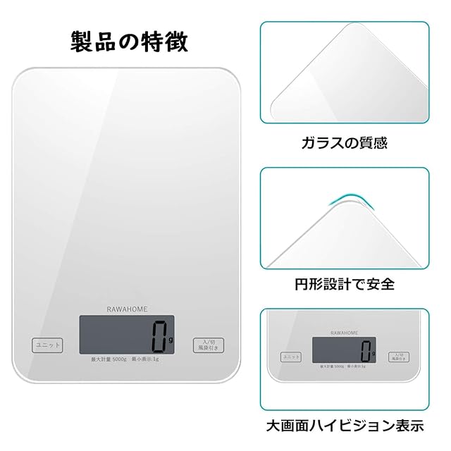 RAWAHOME デジタルスケール キッチン電子スケール 高精度センサー 1g~5kg 多機能 正確 シンプルなデザイン
