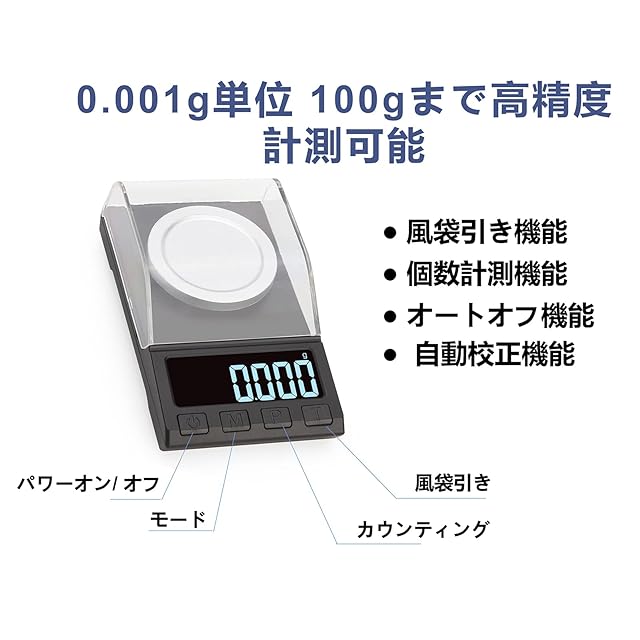 【精密スケール】 0.001g単位で100gまで計量可能なデジタルスケール【最小表示】: 0.01g【最大計量】: 100g(注意)精度:0.001gですので、環境の影響は注意しないといけない。安定の測りのため、測る前には、必ず平らなところに水平にハカリをお置きください。※電力の残量ははかりの精度に影響しますので、バッテリーを交換してくださいませ。