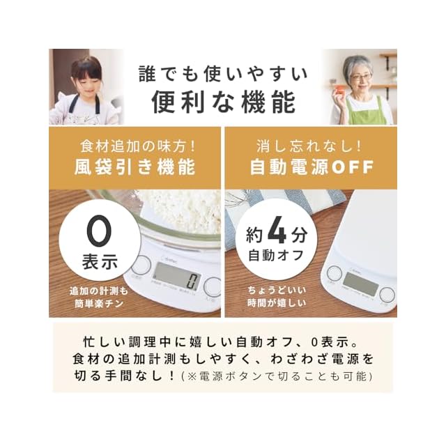 ボタンひとつで容器の重さを引いて計れる風袋引き機能付き。「0表示」ボタンを押すだけなので調理中も手を止めることなく作業が可能です。