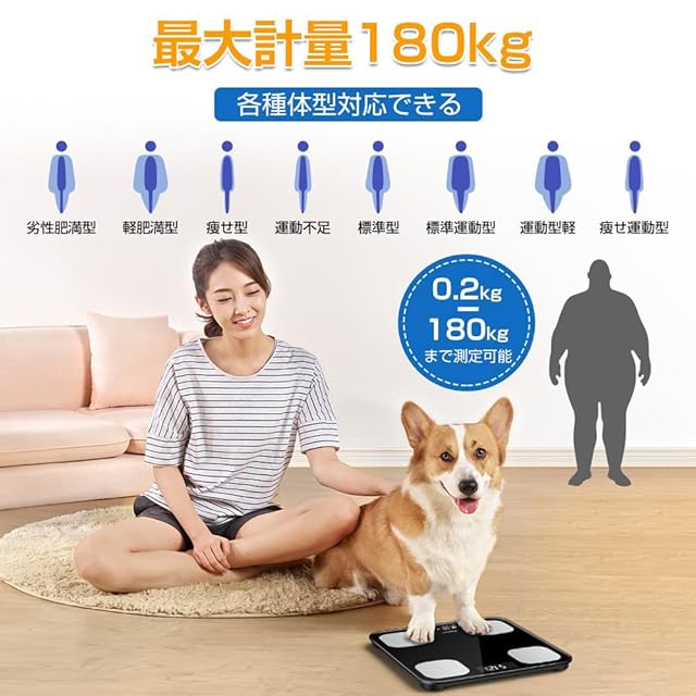 商品名:【2025新登場】体重計 体脂肪計 体組成計 Bluetooth スマホ連動 ヘルスメーター 高精度 軽量 収納 ボディスケール 多機能測定 体重 体脂肪率 筋肉率 体水分率 BMI など測定 iOS/Android対応 日本語取扱説明書 (ブラック)