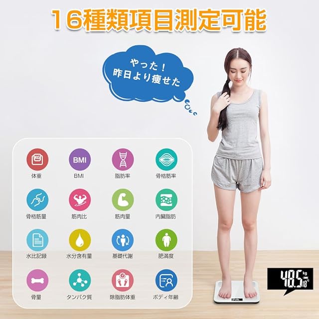 【16種類の指標測定】体脂肪計は体重/BMI/体脂肪率/筋肉量/内臓脂肪レベル/水分率/骨格筋率/体年齢/ボディタイプなどの16種類の身体状態を測定することができます。測定結果に基づいて、体重管理をより良く行うことができます。