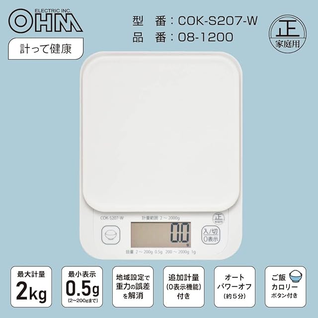 オーム電機 キッチンスケール クッキングスケール デジタルはかり デジタル計り 料理用はかり 2kg計 ご飯カロリーボタン付き ホワイト COK-S207-W 08-1200 OHM