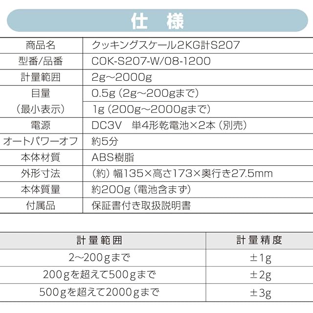 ◆付属品:書付き取扱説明書 ≪計量精度≫(計量範囲/計量精度) ・2~200gまで/±1g ・200gを超えて500gまで/±2g ・500gを超えて2000gまで/±3g