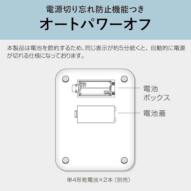 【 仕 様 】 ◆計量範囲:2g~2000g ◆目量(最小表示):0.5g(2g~200gまで)、1g(200g~2000gまで) ◆電源:DC3V 単4形乾電池×2本(別売) ◆オートパワーオフ:約5分 ◆本体材質:ABS樹脂 ◆外形寸法:(約)幅135×高さ173×奥行27.5mm ◆本体質量:約200g(電池含まず)