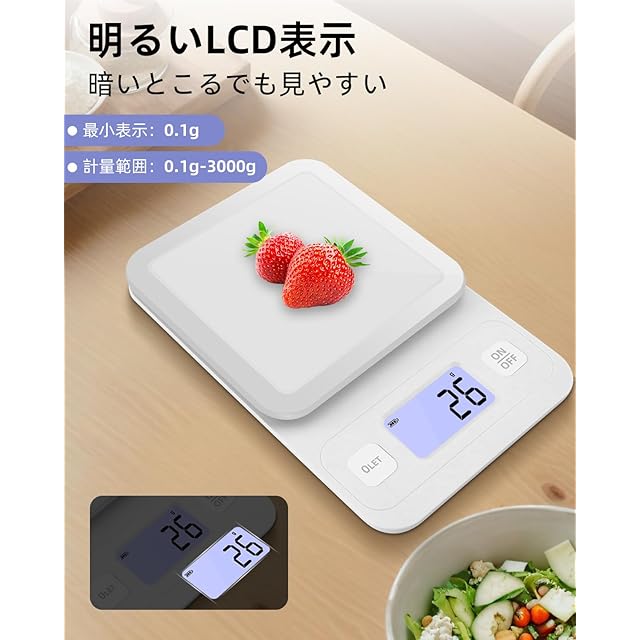 デジタルスケール クッキングスケール キッチンスケール 料理 デジタル ディスプレイ 風袋引き機能 全視野 バックライト画面 はかり 0.1gから3.0kgまで 電子スケール コンパクト (01white)