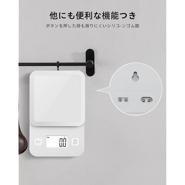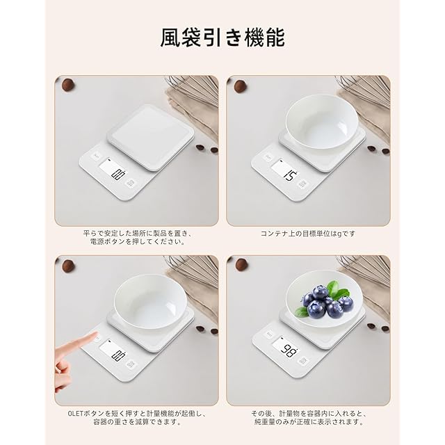 【高い機能性で毎日の使いやすさを追求】使用しない時は自動で電源オフになるオートオフ機能搭載で、うっかり電源を切り忘れても電池の消耗を防ぎます。タレボタン(計量皿を外してもゼロに戻る機能)にも対応しており、容器の重さを差し引いた便利な計量が可能です。