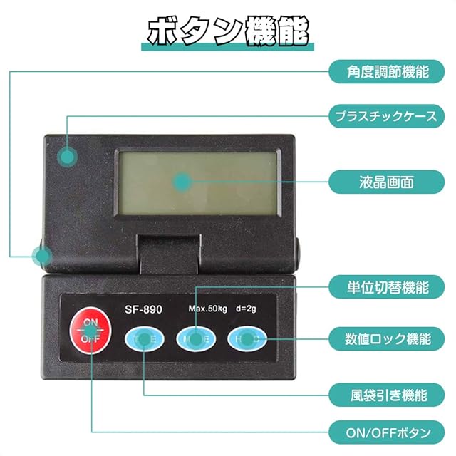【5つの機能】:①風袋引き機能、②表示単位切替機能 グラム(g) キログラム(kg)、③数値ホールド(ロック)機能、④バックライト機能、⑤オートパワーオフ機能。