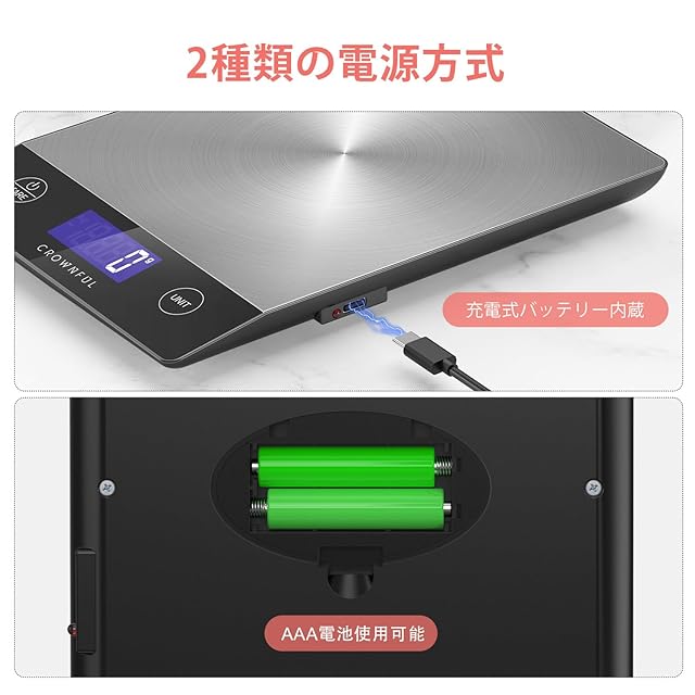 【2種類の電源方式で便利に】このデジタルスケールは、AAA電池とUSB充電の二つの電源方式をサポートしており、バッテリーが切れたときでもUSB経由で迅速に充電可能です。これにより、作業中断を最小限に抑えることができます。