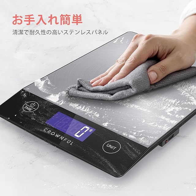商品名:CROWNFUL キッチンスケール 15KG USB充電式 ステンレス デジタル はかり 表面防水 防汚 1g単位 LCD ディスプレイ 軽量 薄い 電子 測り 計量器 料理 調理 お菓子作り 薄い 風袋引き機能