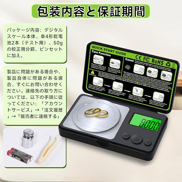 【包装内容と期間】パッケージ内容:デジタルスケール本体、単4形乾電池2本(テスト用)、50gの校正用分銅、スモールカバー、ピンセットに加え。製品に問題がある場合や、製品自体に問題がある場合、すぐにお問い合わせください。連絡先の取り方については、以下の手順に従ってください:「アカウントサービス」→「注文履歴」→「販売者に連絡する」