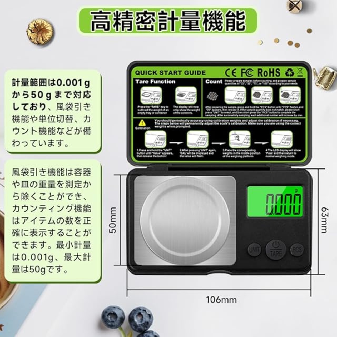 【高精密計量機能】計量範囲は0.001gから50gまで対応しており、風袋引き機能や単位切替、カウント機能などが備わっています。風袋引き機能は容器や皿の重量を測定から除くことができ、カウンティング機能はアイテムの数を正確に表示することができます。最小計量は0.001g、最大計量は50gです。