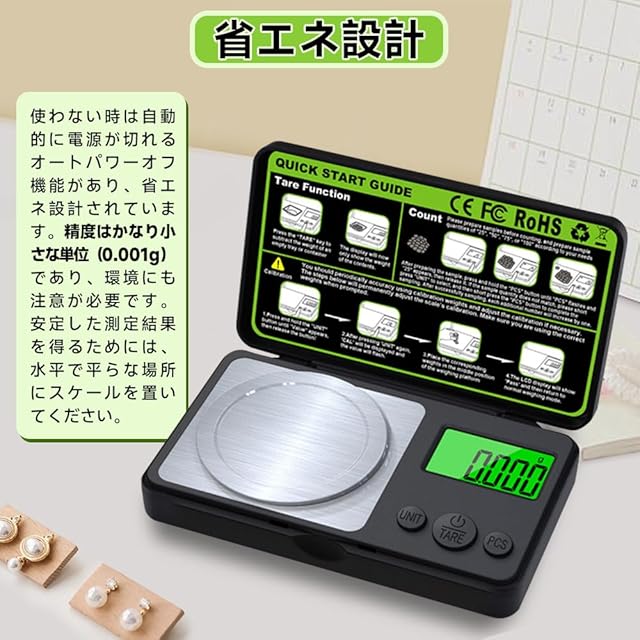 【省エネ設計】:使わない時は自動的に電源が切れるオートパワーオフ機能があり、省エネ設計されています。精度はかなり小さな単位(0.001g)であり、環境にも注意が必要です。安定した測定結果を得るためには、水平で平らな場所にスケールを置いてください。