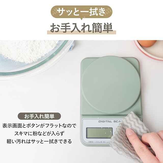 薄さ約23mm!正確性と収納性に優れた薄型デジタルキッチンスケール 0.1g単位で計れる「微量モード」搭載 0表示ボタンで容器内の重さだけを量れます。 応答性が早いセンサーを採用することで計量時にありがちな数値表示のタイムラグを解消。 約2分間使用していないと自動的に電源が切れるオートオフ機能を搭載しているので、切り忘れによる電池の消耗を防ぎます。 限られたキッチンスペースを効率よく活用できる薄さ約23mmの薄型設計で、引き出しへの収納やスリムな形状を活かして立て掛けて収納することも可能です。